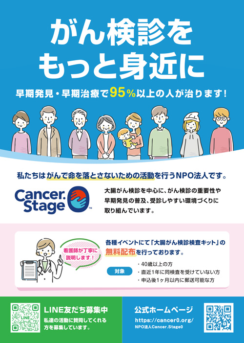 NPO法人Cancer.Stage0では、大腸がんの無料検診イベントを開催いたします。